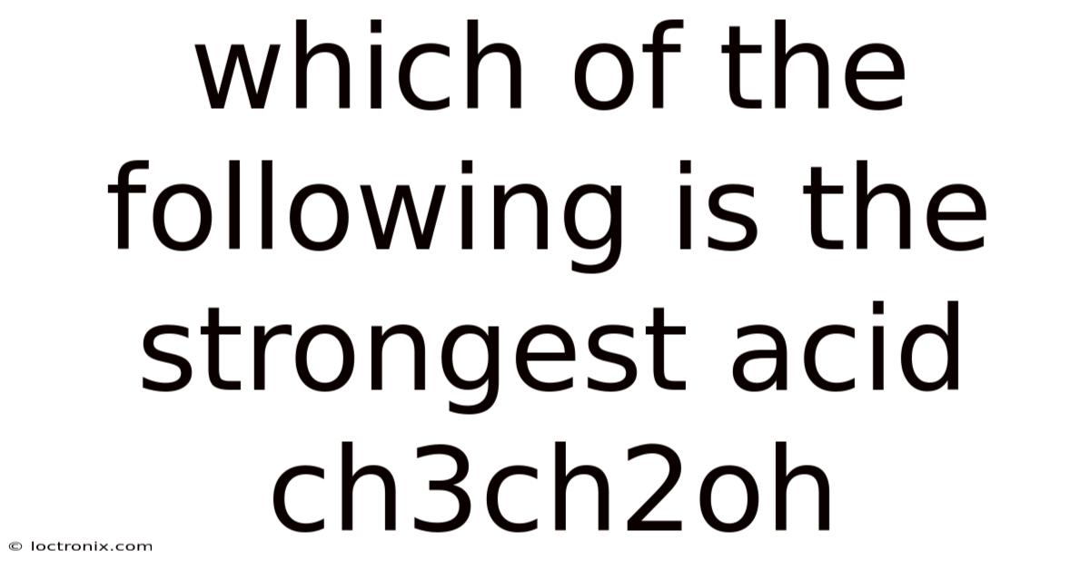 When comparing chemical compounds to determine which of the following is the strongest acid CH3CH2OH, look at the principles of acidity, molecular structure, and the behavior of different substances in aqueous solutions — this one isn't optional. CH3CH2OH, commonly known as ethanol, is a familiar organic compound found in alcoholic beverages and used as a solvent. To accurately address this question, we must explore the nature of acids, compare ethanol with other common acids, and examine the factors that influence acidity, such as bond strength, electronegativity, and stability of the conjugate base. On the flip side, its acidic properties are often misunderstood. This analysis will clarify why ethanol is not a strong acid and identify what characteristics define a truly strong acid Most people skip this — try not to. Simple as that..
